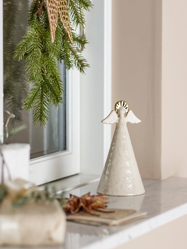 Aniołek Liza Deco marki Bloomingville. Wykonany z kamionki z pięknym białym szkliwem. Ta piękna dekoracja dodaje odrobinę elegancji do świątecznego wystroju i doskonale nadaje się do tworzenia przytulnej atmosfery w czasie Bożego Narodzenia.