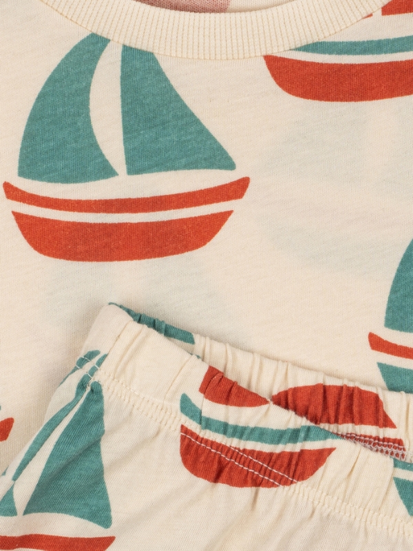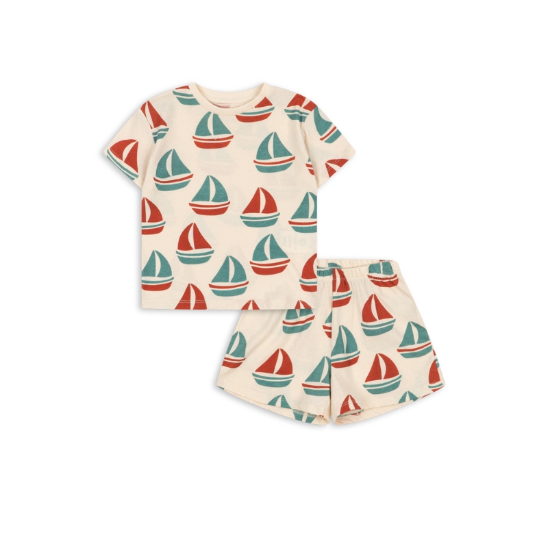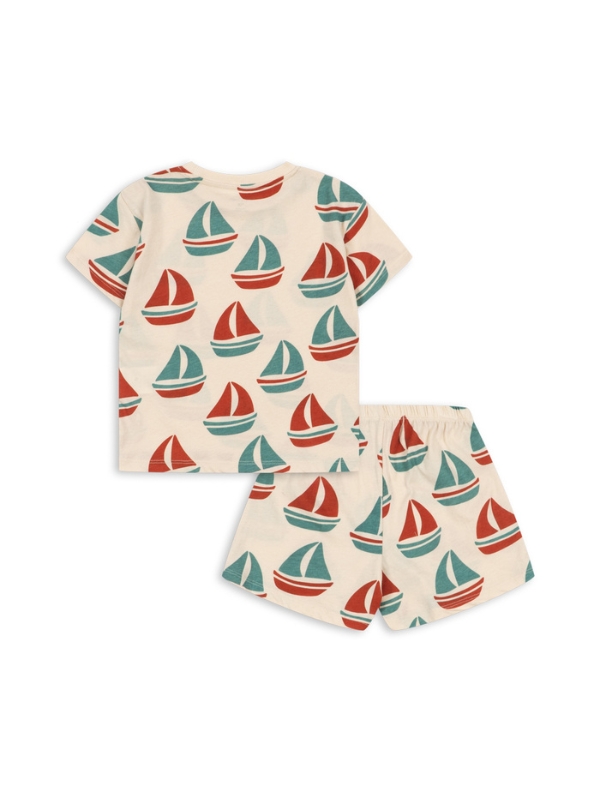 Komplet dziecięcy składający się z koszulki i spodenek z miękkiej organicznej bawełny marki Konges Slojd. Zaprojektowany z motywem żeglarskim w subtelnej kolorystyce. Idealnie sprawdzi się w domu i na zewnątrz. Wykonany z bawełny organicznej z domieszką elastanu. Produkt jest certyfikowany przez CU1094701.
