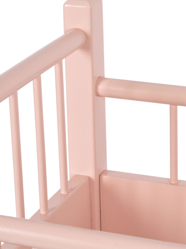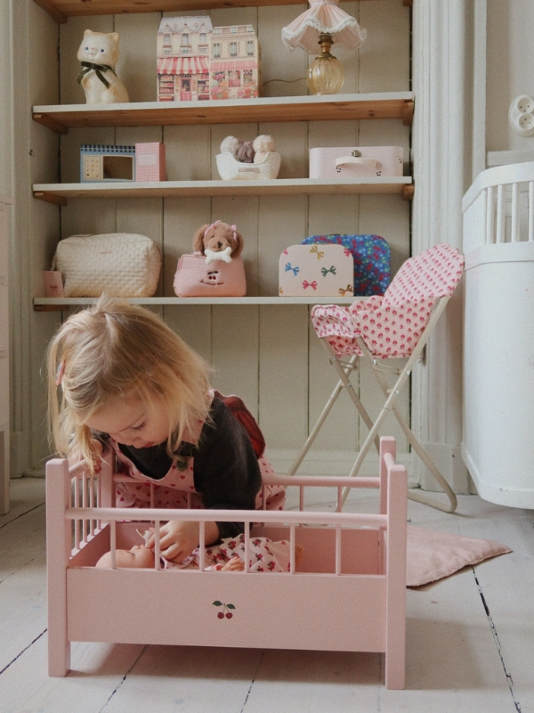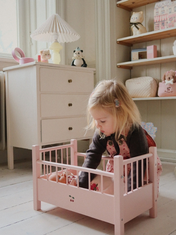 Stwórz własną przestrzeń do spania dla lalek z naszym drewnianym łóżeczkiem marki Konges Slojd. Delikatny różowy kolor i piękny nadruk z wisienką dodają łóżeczku niezwykłego uroku. Zaprojektowane z klasycznymi barierkami. Produkt wykonany z drewna bukowego z certyfikatem FSC™, drewna herbacianego i płyty MDF. Numer licencji: FSC C177572.