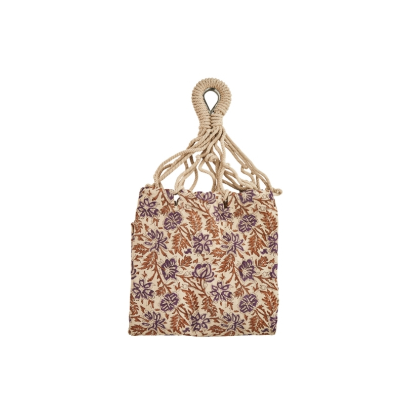 Hamak w stylu boho z ciekawym nadrukiem w kolorach camelu, brązu i ciemnego fioletu marki Madam Stoltz. Idealny na relaks w ogrodzie.