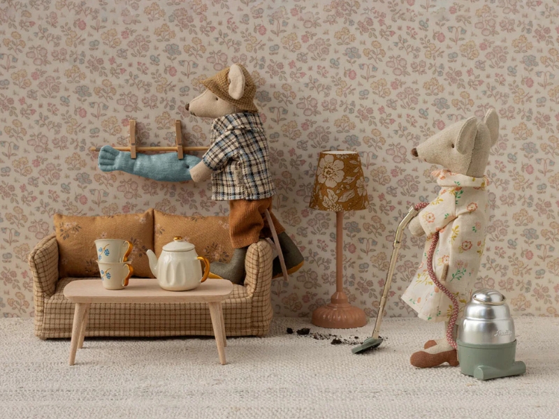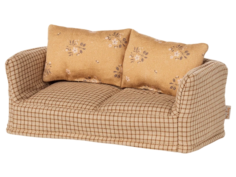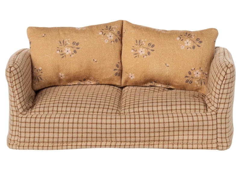 Kanapa dla myszek marki Maileg. Każda rodzina potrzebuje miękkiej kanapy, na której może odpocząć. Cała rodzina myszek może wygodnie na niej usiąść i miło spędzić czas. Sofa idealnie pasuje do salonu w mysim domku. Doskonała propozycja na prezent. Ta ponadczasowa zabawka łączy w sobie wysoką jakość wykonania oraz niepowtarzalny urok charakterystyczny dla marki Maileg.