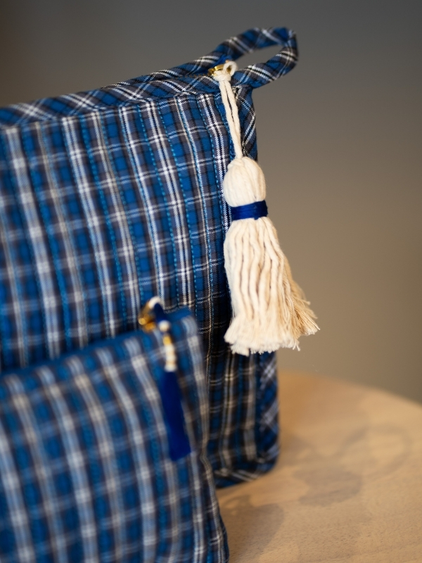 Kosmetyczka marki Madam Stoltz. Dzięki swojemu optymalnemu rozmiarowi będzie świetnym rozwiązaniem do torebki. Została ozdobiona ręcznie robionym frędzlem wykonanym przez kobiety z Nai Disha’s Empowerment Program w New Delhi. Kobiety tworzą frędzle do wszystkich naszych torebek i kosmetyczek, co nadaje każdemu egzemplarzowi charakterystyczny styl, a każdy zakup wspiera podróż kobiet w kierunku niezależności finansowej.