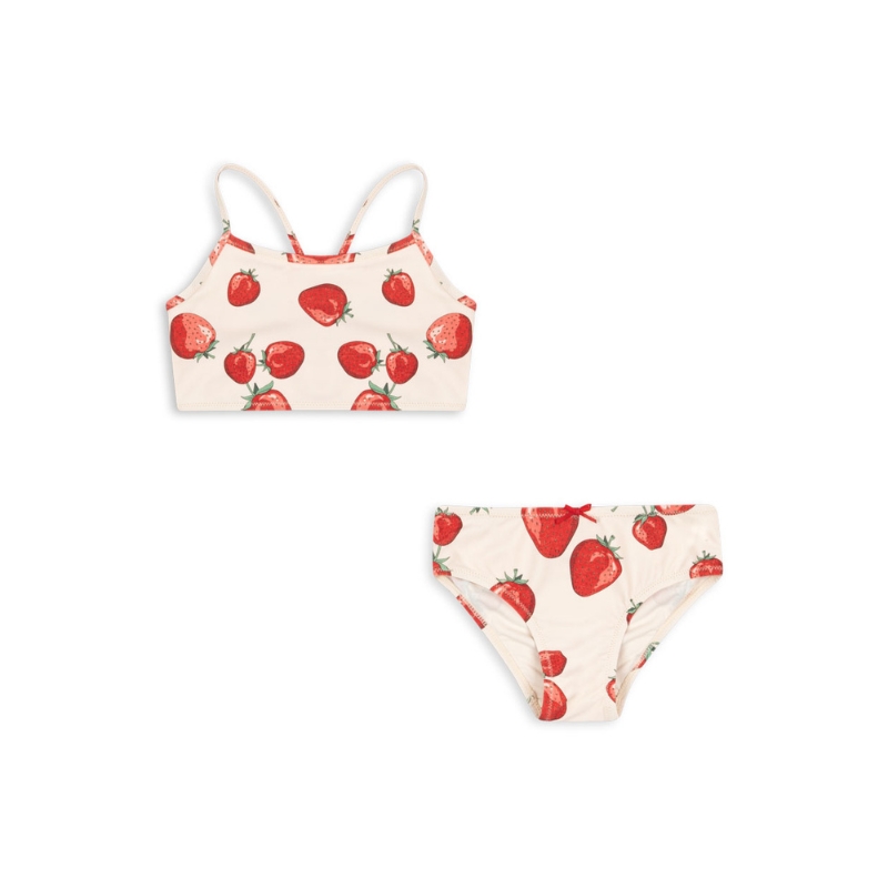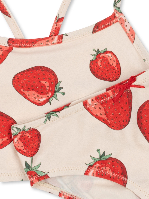 Dwuczęściowy komplet do pływania marki Konges Slojd. Idealna propozycja na letnie dni na plaży lub basenie. Elastyczny materiał z letnim motywem truskawek i uroczym elementem kokardki. Strój został wykonany z poliestru z recyklingu z certyfikatem GRS certyfikowanego przez CU 1094701. Produkt ten posiada certyfikat OEKO-TEX® STANDARD 100, klasa 1 wydany przez DTI Tekstil, DTI 2276-361.