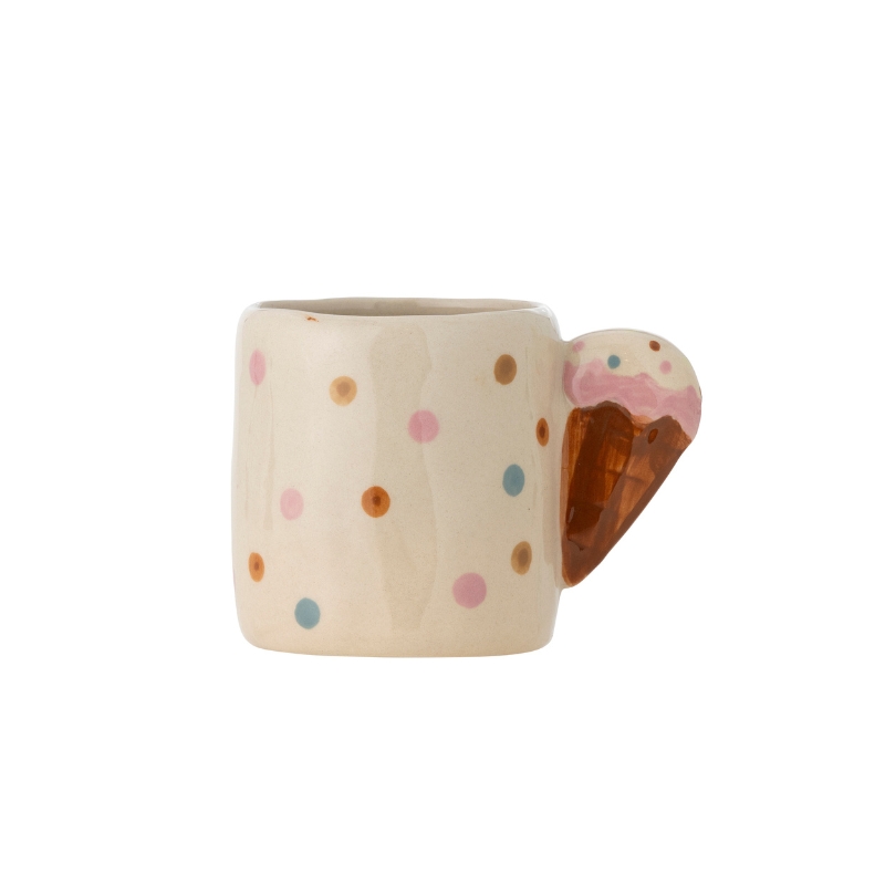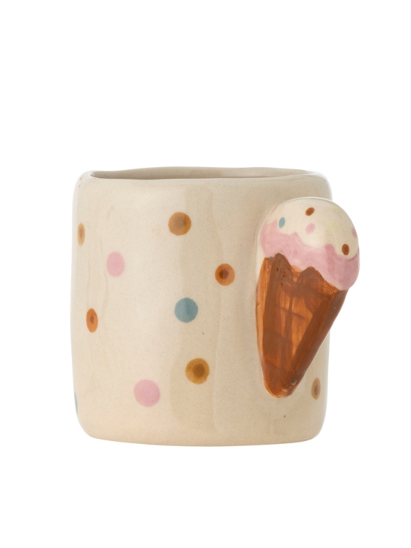 Kubek Creamy marki Bloomingville Mini jest ozdobiony drobnymi kropkami w jasnych kolorach, które nadają całości lekkiego, radosnego designu. Dodatkowym uroczym elementem dekoracyjnym jest uchwyt w kształcie rożka do lodów. Rozmiar jest idealny dla małych rączek. Kubek jest wykonany z kamionki, dzięki czemu idealnie nadaje się do serwowania zarówno zimnych, jak i gorących napojów.