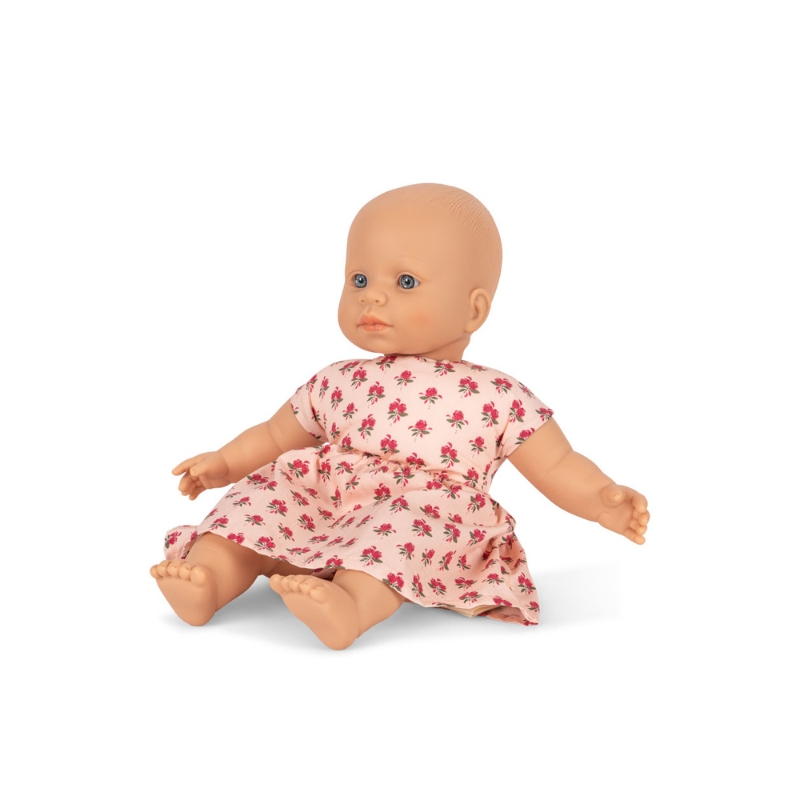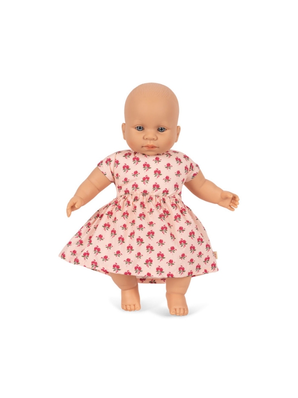 Nasza śliczna lalka Kallis może zostać Twoją nową najlepszą przyjaciółką. Idealnie miękka i przytulna. Wykonana z winylu. Ubrana w bawełnianą sukienkę – łatwa do zakładania i zdejmowania przez dziecko. Materiał jest w jasnoróżowym kolorze. Dodatkowego uroku dodają kwiatki zdobiące sukienkę. Lalka ma przyciągające uwagę oczy o głębi i realistycznym kolorze.