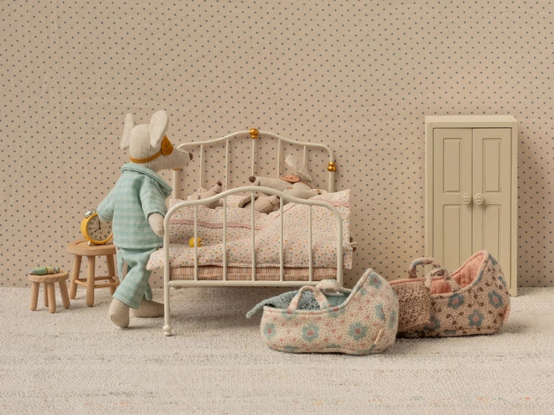 Łóżko podwójne dla myszek marki Maileg. Zaproś swoje myszki na noc w przepięknym, metalowym łóżku. W zestawie znajduje się miękka pościel z naszych specjalnych, drukowanych tkanin Maileg. Idealnie pasuje do wszystkich myszek. Doskonała propozycja na prezent. Ta ponadczasowa zabawka łączy w sobie wysoką jakość wykonania oraz niepowtarzalny urok charakterystyczny dla marki Maileg.