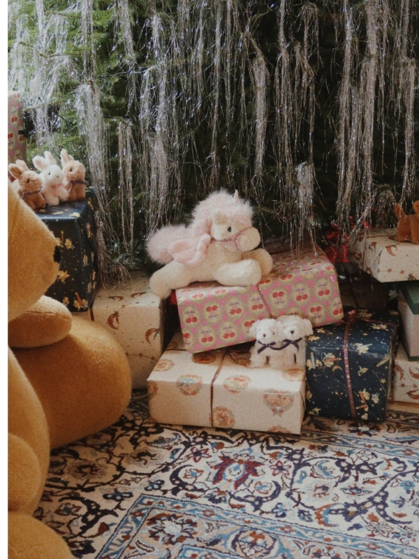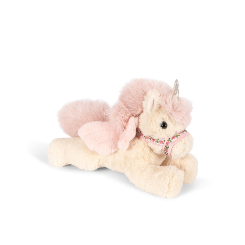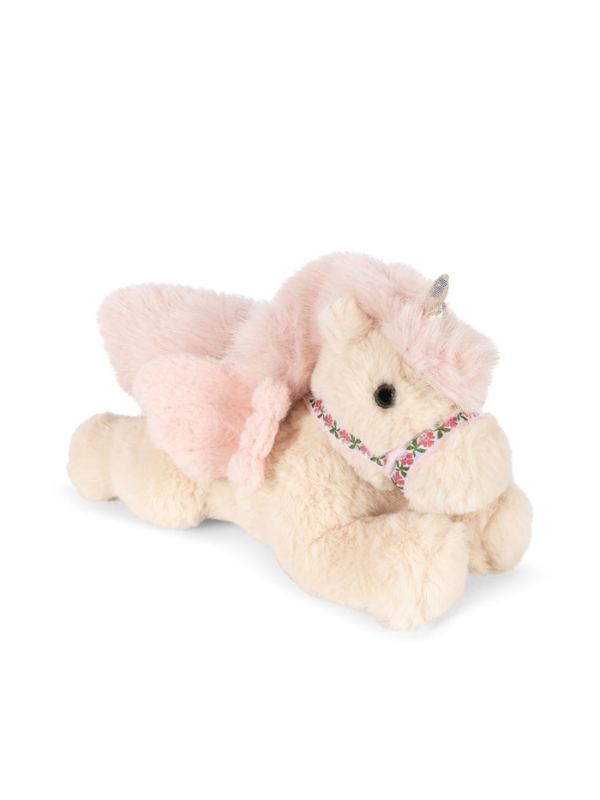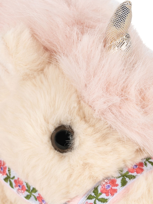 Pluszowy jednorożec marki Konges Slojd. Konik ma różową, puszystą grzywę i ogon. Wyróżniającym atutem są skrzydełka i połyskujący róg jednorożca. Kucyk ma dodatkowo założoną uzdę z uroczymi naszywkami w kwiatki. Oznaczony certyfikatem CE.