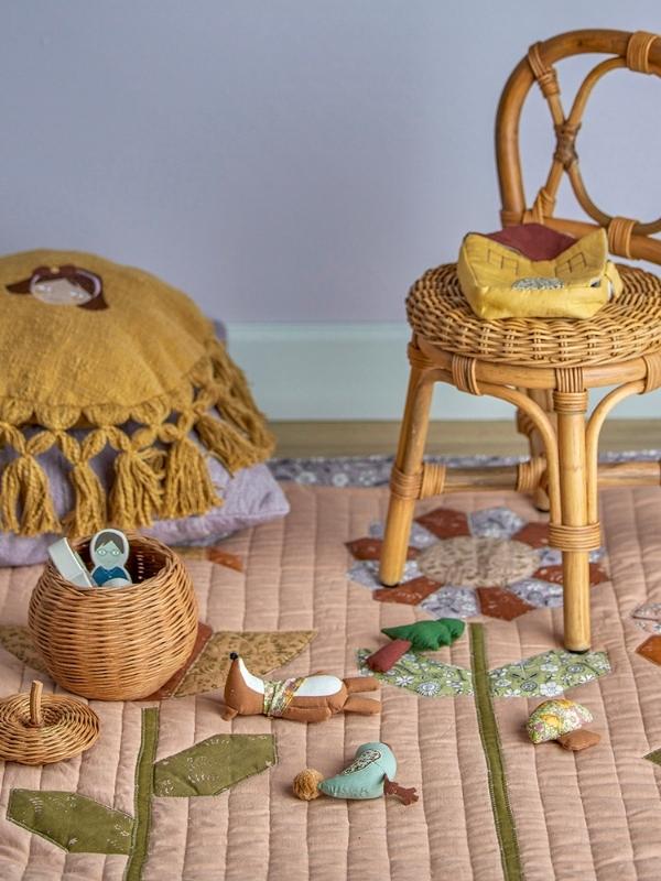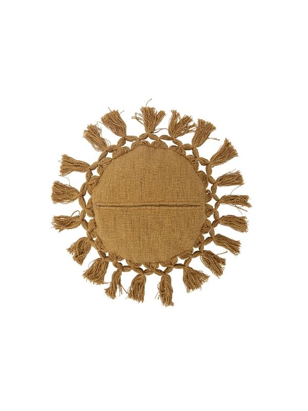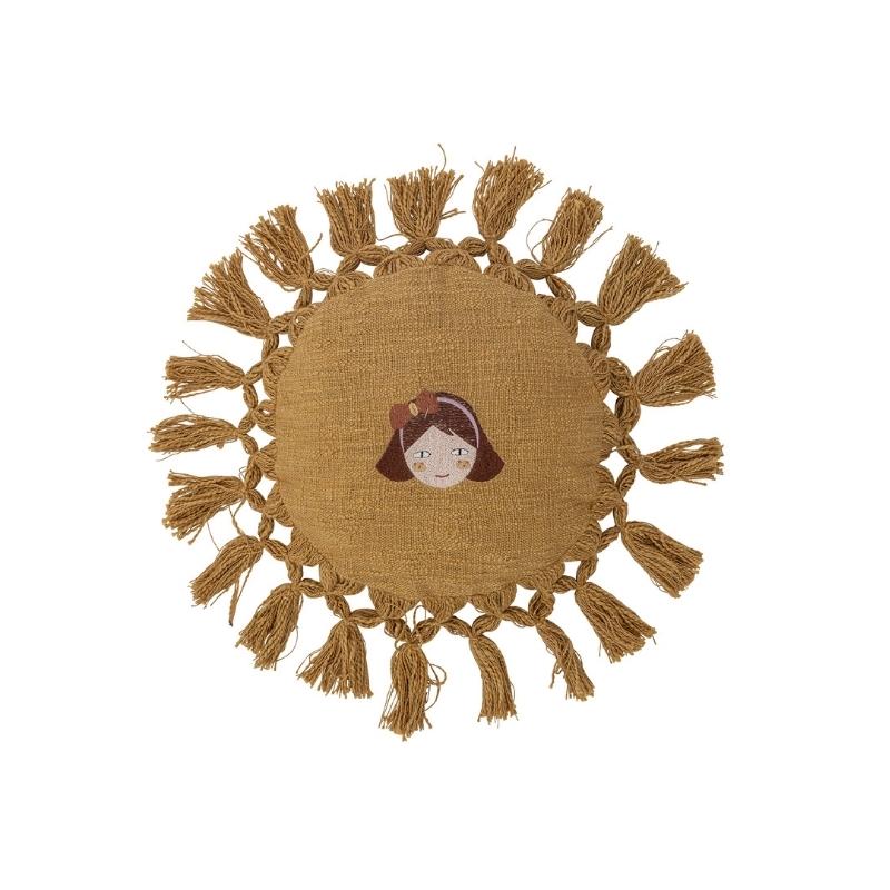 Okrągła poduszka Elinna od Bloomingville Mini z frędzlami w żółtym kolorze z wyhaftowaną małą dziewczynką.
