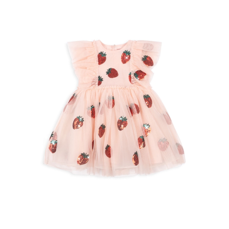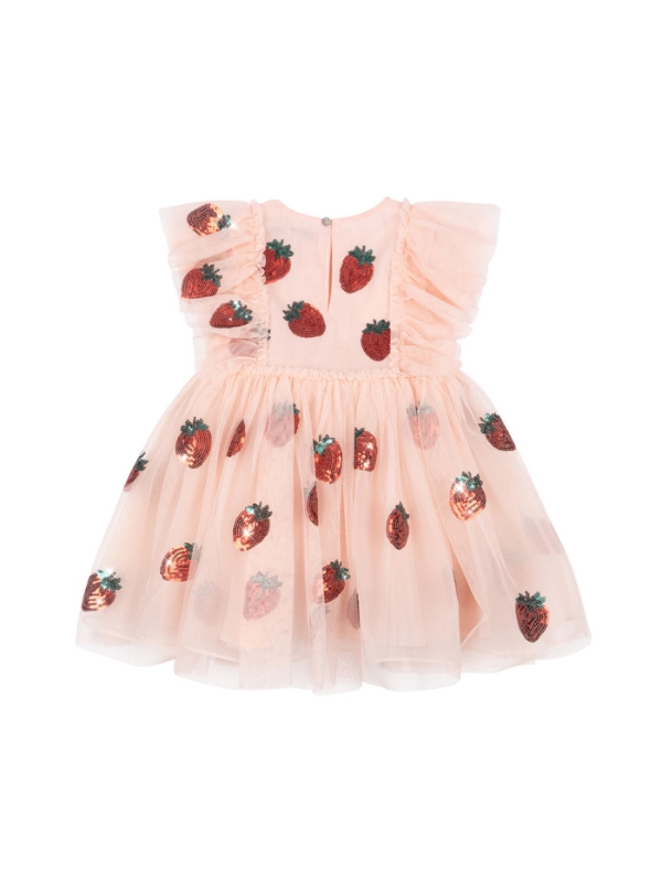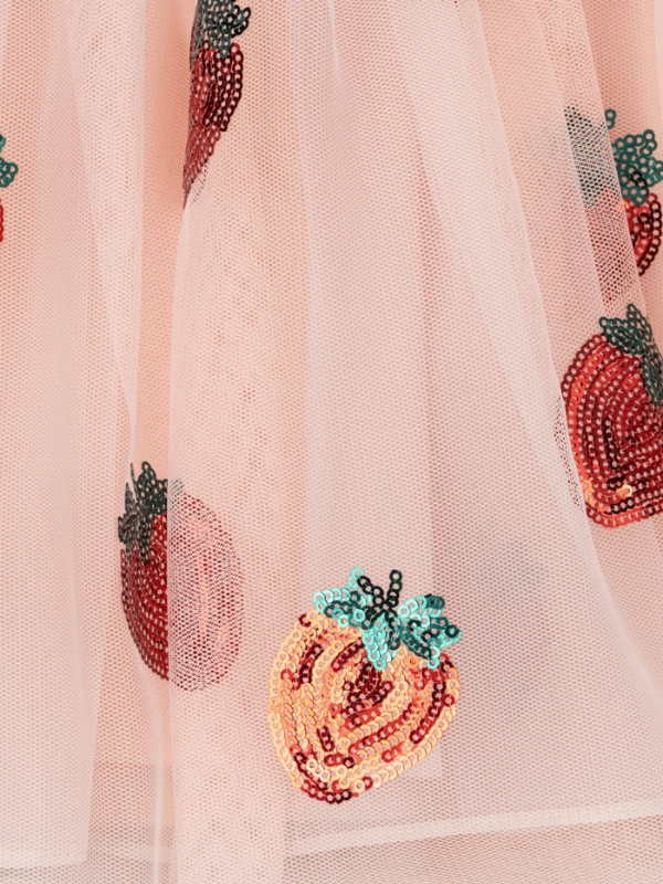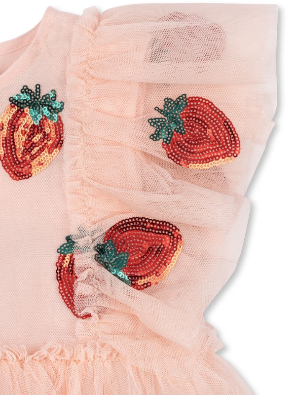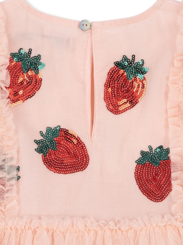 Tiulowa sukienka marki Konges Slojd to przepiękny strój dla każdej małej dziewczynki. Spódnica ma falbanki i jest delikatnie rozkloszowana, dzięki czemu pięknie się prezentuje. Została zaprojektowana z trzech warstw materiału dla większej objętości. Krótkie, tiulowe rękawki są ślicznym elementem dopełniającym całą sukienkę. Sukienka jest dodatkowo ozdobiona pięknymi naszywkami w motywie truskawek.