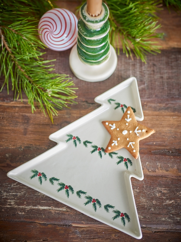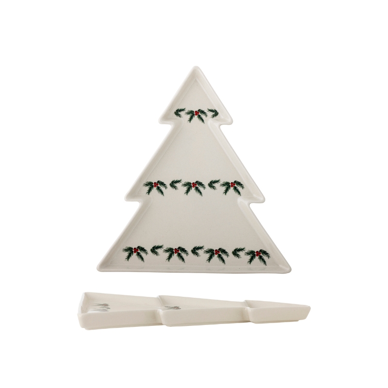 Talerz do serwowania Berry marki Bloomingville. Wyjątkowy kształt choinki i nadrukowany, świąteczny motyw dodają naczyniu świątecznego klimatu. Idealnie sprawdzi się zarówno do podawania świątecznych przystawek lub jako element dekoracyjny przy rodzinnym stole. Neutralny i elegancki design talerza ułatwia integrację z innymi dekoracjami świątecznymi.