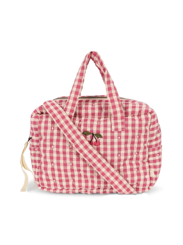 Funkcjonalna torba do przewijania lalek. Wykonana w 100% z bawełny organicznej. Na zewnątrz torba ma dodatkową dużą kieszeń do przechowywania. Zaprojektowana z paskiem na ramię, a także uchwytami do chwycenia i noszenia. Torba zamykana na suwak. Uroczym detalem są małe różyczki przy uchwytach. Must have dla wszystkich rodziców lalek.