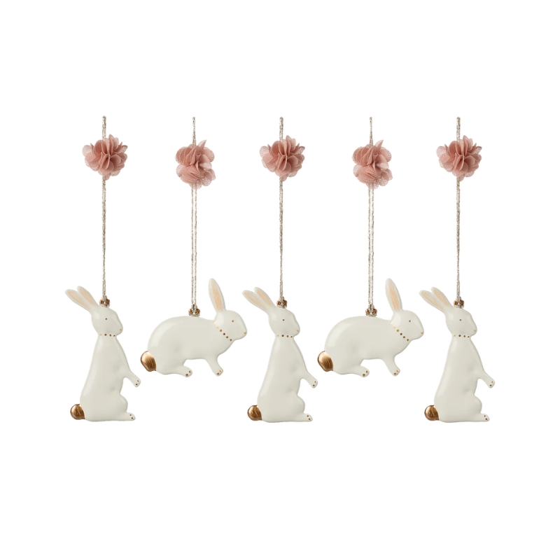 Zestaw pięciu zawieszek z króliczkami marki Maileg. Białe, metalowe zajączki ozdobione złotymi detalami. Uroczym elementem dekoracyjnym są również różowe pompony przyczepione do sznurka. Udekoruj swój dom pięknymi ozdobami.