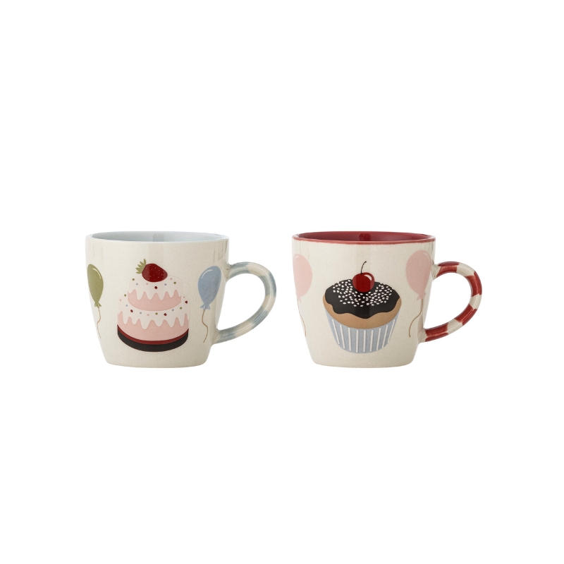 Zestaw dwóch kubków kamionkowych z kolekcji Darby marki Bloomingville Mini. Kubeczki są ozdobione radosnymi motywami. Wzory przedstawiają różne ciasta i balony, a środek zdobią niebieskie lub czerwone paski. Mają idealny rozmiar dla małych rączek i można ich używać do serwowania zarówno gorących, jak i zimnych napojów.